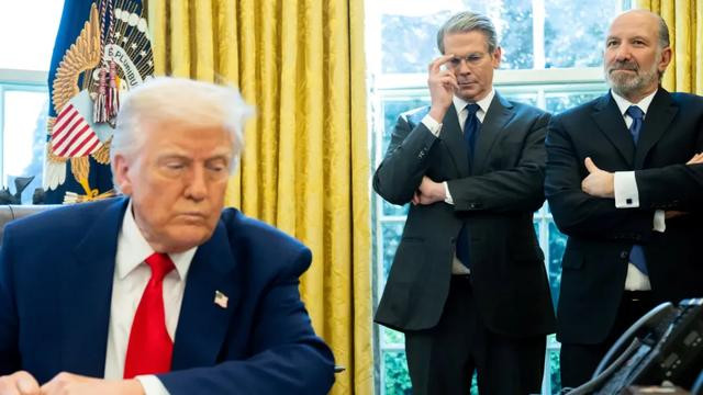 ▲美国财政部长贝森特和商务部长卢特尼克在椭圆形办公室旁观看特朗普的讲话。