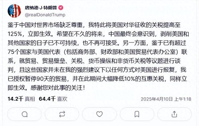 怎么看当前的事态?特朗普除了保持10%的基准关税,暂停了对其他国家的更多关税,为期90天,同时他将对中国的关税提升至125%。这仅仅是因为他说的“市场有些吵闹”,以及其他国家“态度好”,中国“态度不好”,他才做了这个区分吗?如果这样看,就太简单了。